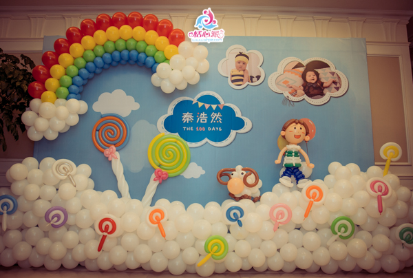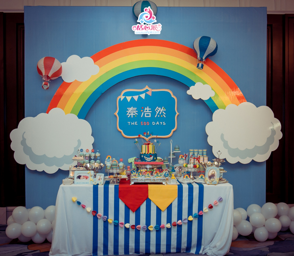 彩虹糖的梦,充满甜蜜和快乐;它是载着希望的翅膀,翱翔于蔚蓝的天空~!这场以彩虹为主题的宝宝百日宴,缤纷的彩虹搭配天空蓝,超级韩范儿!明亮的跑马灯围成一圈,亮闪闪的灯泡给舞台烘托出另类的绚丽~!