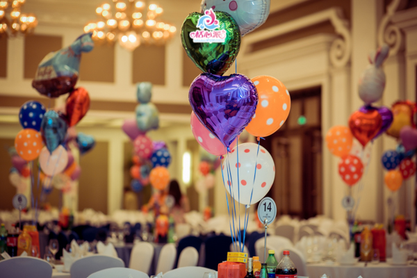 波点气球永远是气球布置的焦点。每桌用两种不同颜色的铝膜气球加三只暖色系的波点气球点缀,令的本就暖融融的现场更加的充满童真。就在现场嘉宾用餐完毕之前,所有的波点气球和铝膜气球都被孩子们一抢而光。
