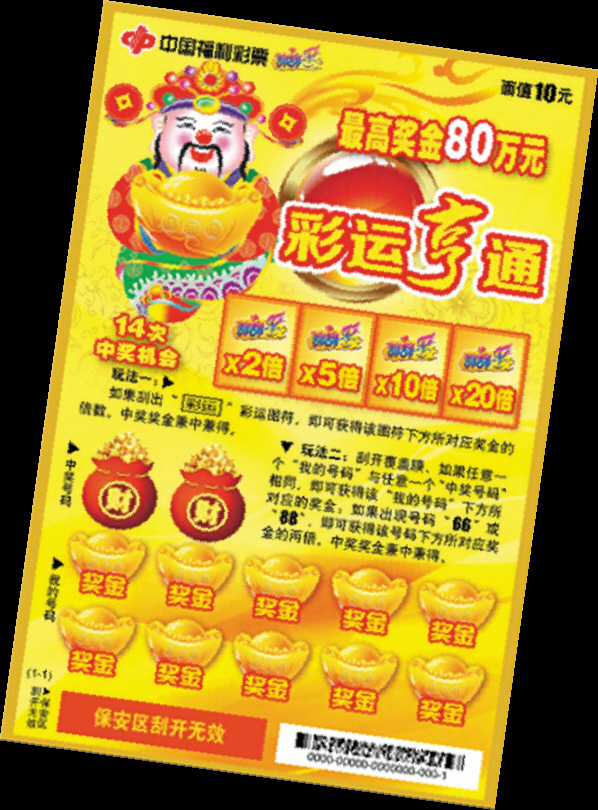 彩运亨通彩票采用市面最受欢迎的数字对比式+固定号码,翻倍式玩法;简单易懂,对奖方便,点明主题。本款彩票头奖高,中低奖层出不穷。本彩票共有两个玩法,两个玩法区内的中奖奖金兼中兼得。玩法一:刮开覆盖膜,如果刮出“彩运”图符,即可获得该图符下方所对应奖金的倍数。中奖奖金兼中兼得。玩法二:刮开覆盖膜,如果任意一个“我的号码”与任意一个“中奖号码”相同,即可获得该“我的号码”下方所对应的奖金;如果出现号码“66”或“88”,即可获得该号码下方所对应奖金的两倍。中奖奖金兼中兼得。
